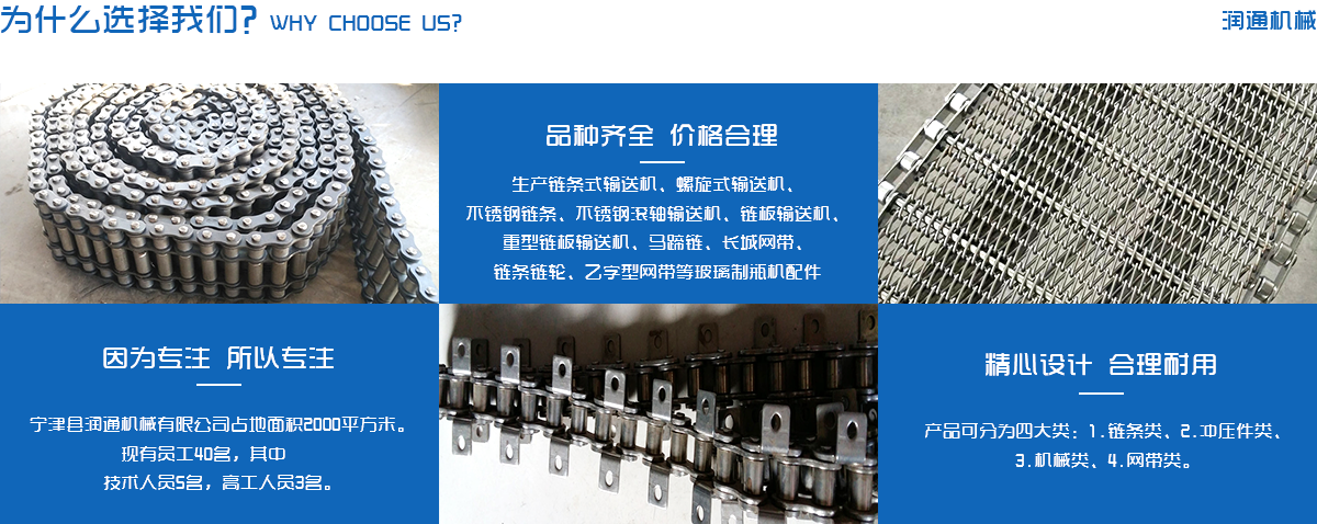 生產(chǎn)鏈條式輸送機(jī)、螺旋式輸送機(jī)、不銹鋼鏈條、不銹鋼滾軸輸送機(jī)、鏈板輸送機(jī)、重型鏈板輸送機(jī)、馬蹄鏈、長城網(wǎng)帶、鏈條鏈輪、乙字型網(wǎng)帶等玻璃制瓶機(jī)配件,食品機(jī)械配件及各種網(wǎng)帶的專業(yè)廠家 ,多年來產(chǎn)品暢銷各地玻璃廠和食品廠,在玻璃制品等行業(yè)中享有較高的聲譽(yù)。公司集摸具開發(fā)、機(jī)械設(shè)計(jì)生產(chǎn),銷售于一體的生產(chǎn)型企業(yè)。生產(chǎn)的自動化流水線金屬傳動網(wǎng)帶、鏈條等產(chǎn)品廣泛用于玻璃機(jī)械、食品機(jī)械、化纖機(jī)械、醫(yī)藥、電子、烘干機(jī)械、輪胎機(jī)械等行業(yè)。產(chǎn)品多銷往各個(gè)城市的機(jī)械廠、食品廠和一些涉及流水線或自動化設(shè)備的公司。